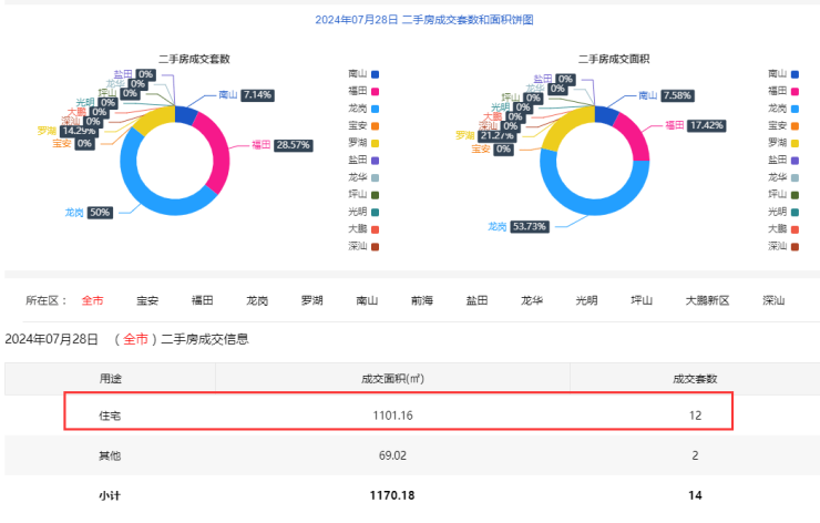 2024年7月28日二手房住宅网签12套。宝安0套;福田2套;龙岗7套;罗湖2套;南山1套;盐田10套;龙华0套;光明0套;坪山0套;大鹏0套。