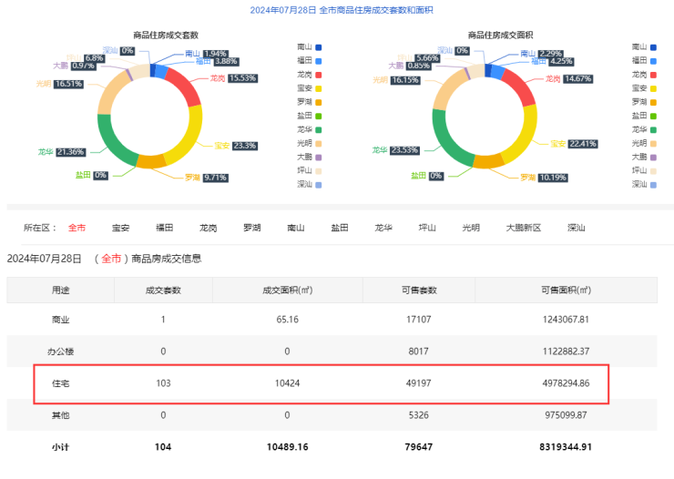 2024年7月28日新房住宅共网签103套。宝安24套;福田4套;龙岗16套;罗湖10套;南山2套;盐田0套;龙华22套;坪山7套;光明17套;大鹏1套;深汕0套。