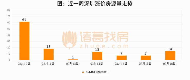 根据诸葛找房数据显示,深圳24小时涨价房源量为14套,较02月15日增加7套,环比上涨100%。与此同时,涨价房源占比小幅扩大,业主信心有所提升。