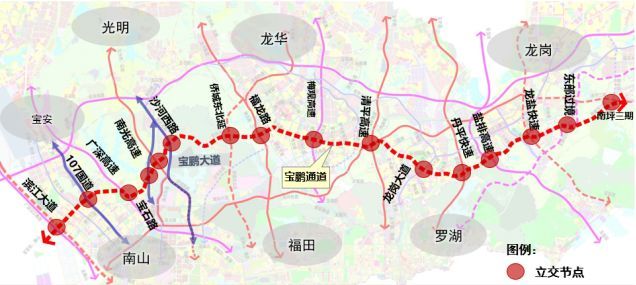 ❶ 南段为水朗至凤凰立交段,长约4.8km,途经石岩、光明南,主路拓宽为双向8车道,采用地面敷设方式;增设双向4车道辅路设置4处互通立交;
