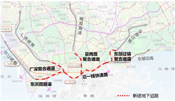 沿城市核心发展主轴上新建东滨隧道跨海连接沿一线、广深复合通道、皇岗复合通道及东部过境复合通道的“一横三纵”地下道路。
