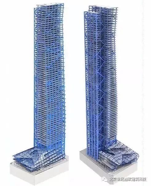 裙房地上结构4层,为钢框架—剪力墙体系,两座核心筒为劲性钢骨柱,裙房西侧为悬挑结构,其外框为复杂桁架结构。