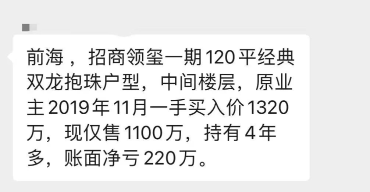 在1月有中介在朋友圈发消息表示:“前海招商领玺一期120平经典户型,中间楼层,原业主2019年11月买入价1320万,现仅售1100万,持有4年,账面净亏220万。”