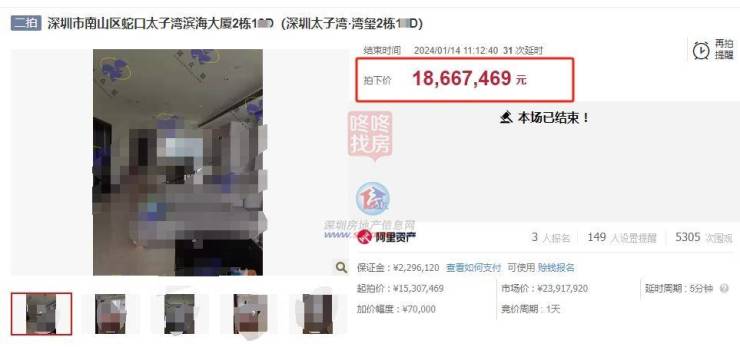1月14日,南山蛇口一套太子湾湾玺建面约192平的法拍房,一拍时没能成交,最终在二拍时以1867万总价成交。