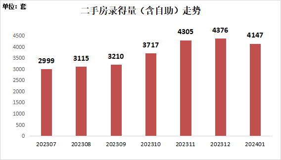 根据深房中协统计,2024年1月全市二手房录得【本文录得量系指深房中协以二手房买卖合同发起时间为口径统计的数据,并非最终成交过户套数】4147套,环比下降5.2%,同比增长128.1%。