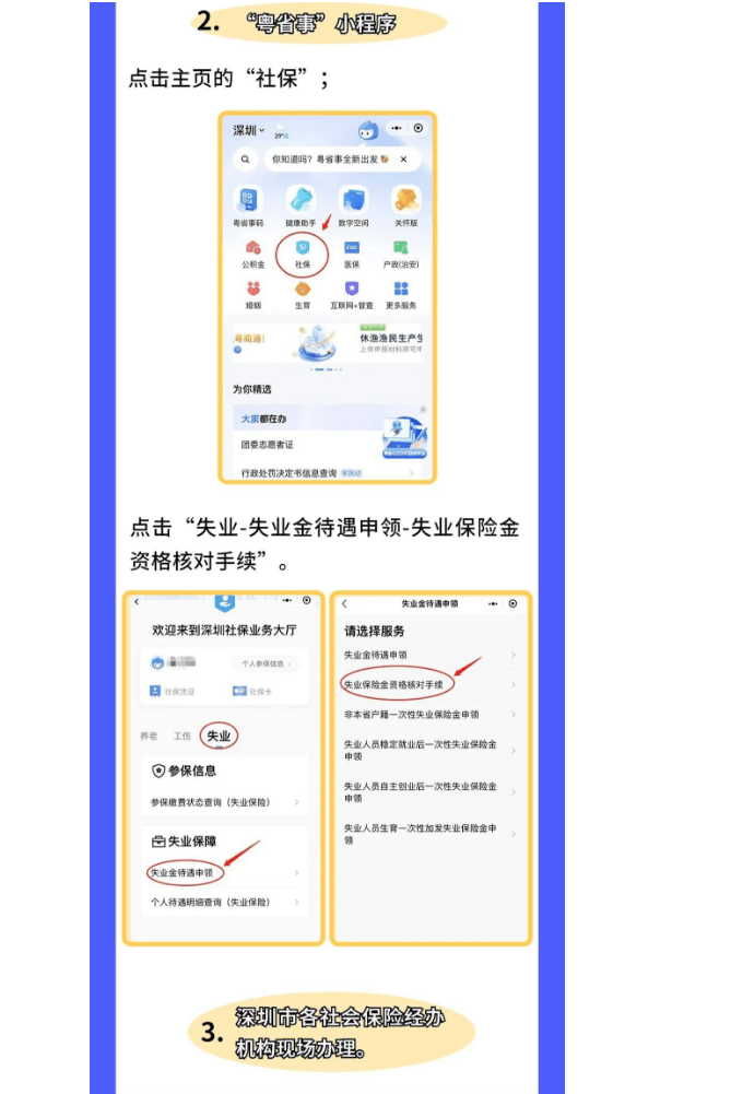 具体操作流程,失业人员可在每月任意一日通过“深圳社保”微信公众号、“粤省事”小程序、深圳市各社会保险经办机构等渠道办理失业保险金资格核对手续。
