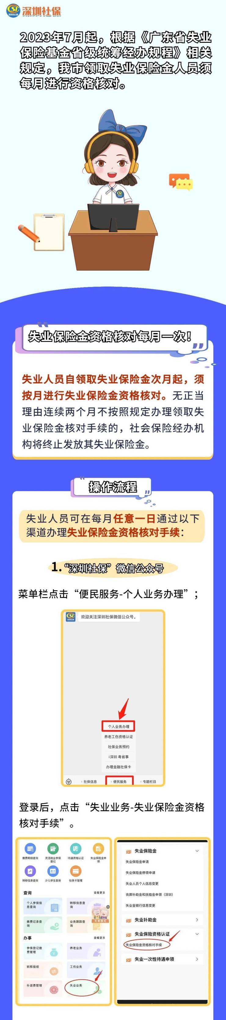 2023年7月起,根据《广东省失业保险基金省级统筹经办规程》相关规定,深圳市领取失业保险金人员须每月进行资格核对。
