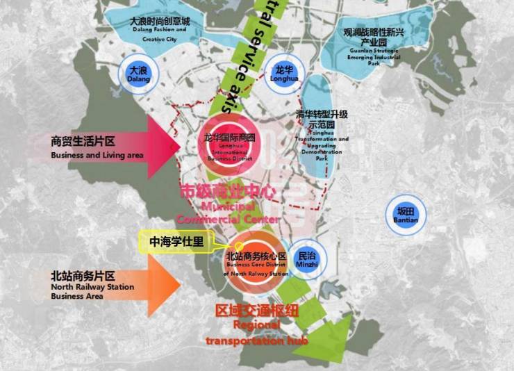 中海学仕里位于龙华民治街道,深圳北站商务区辐射范围内,同时贴近红山商住片区,并与龙华国际商圈共同打造市级商业中心,项目附近有高铁枢纽深圳北站和地铁红山站。
