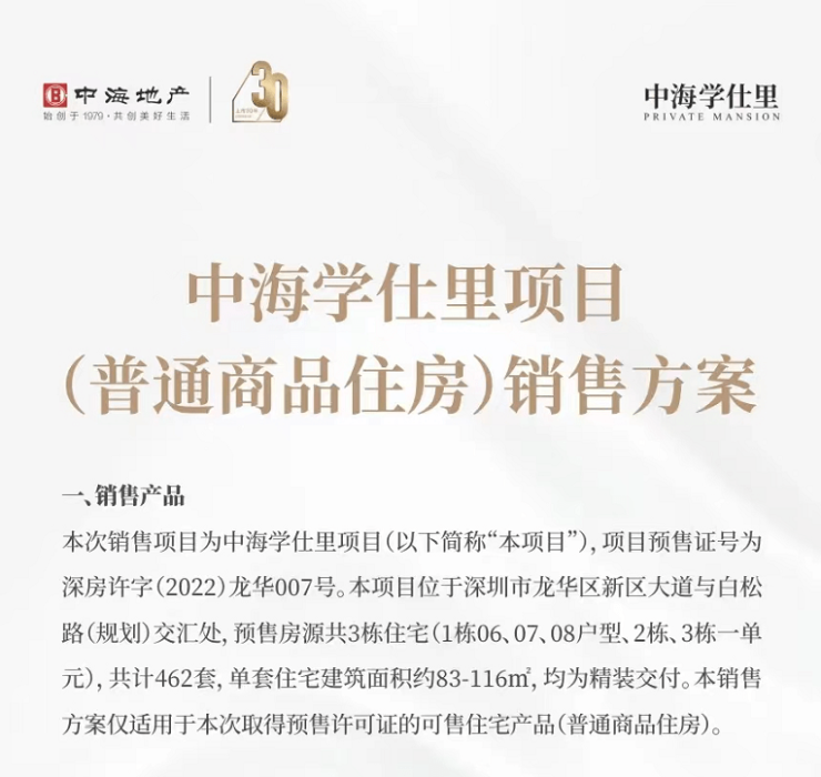 6月19日,龙华中海学仕里获批预售,并发布销售方案,据悉,项目此次推出83-116平465套住宅,备案区间约在7.74-8.5万元/平,均价8.2万/平。具体销售节点如下: