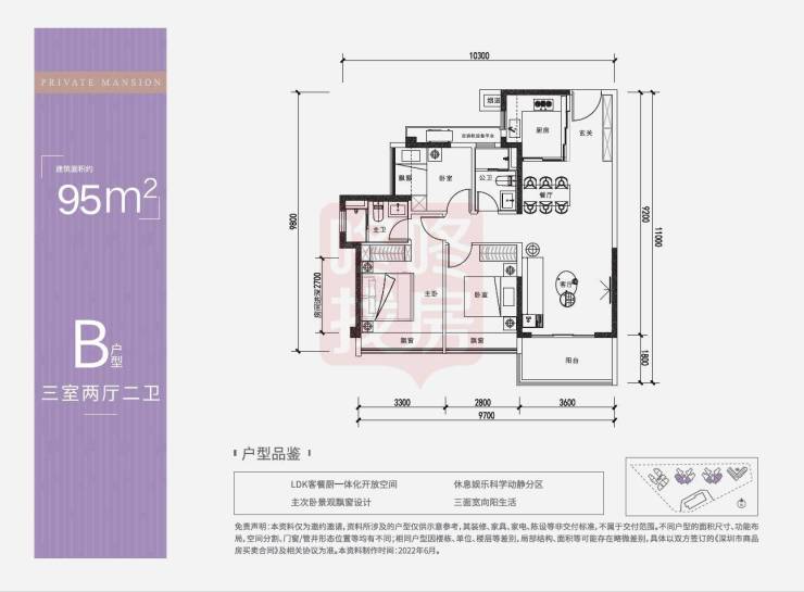 建面约95㎡的三房两卫:可算是建面约86㎡户型的加强版,整体动静分区布局,双面采光,客厅带有大进深阳台明亮舒适。主卧大进深功能全面。双次卧空间均衡使用灵活。餐厨空间宽敞舒适,入户自成玄关私密性佳。