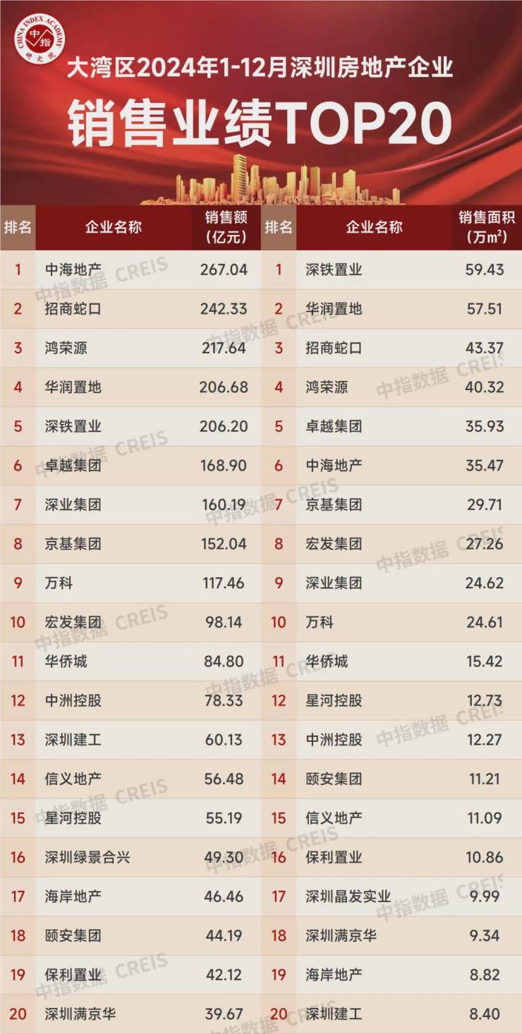 在深圳市场,中海地产同样表现出色。全年销售额达到267.04亿,位居深圳销售榜榜首,销售面积则排名第六。