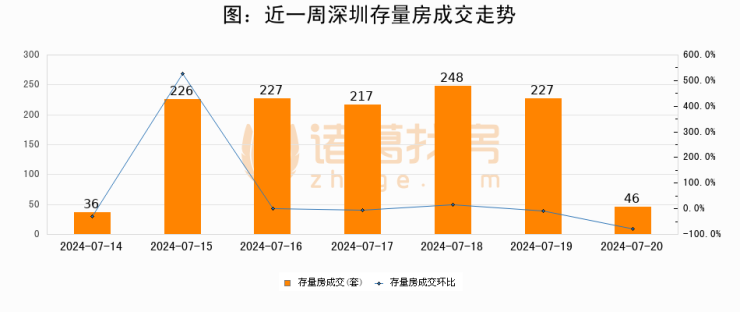 从存量房来看,2024年07月20日深圳存量房单日成交46套,比昨日减少181套,环比下降79.7%。从近一周存量房成交来看,深圳存量房日均成交套数为175套,07月20日单日成交46套,低于近一周平均水平73.7%。
