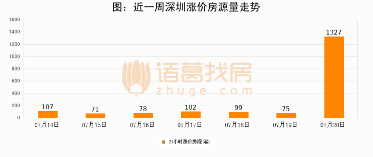根据诸葛找房数据显示,深圳24小时涨价房源量为1327套,较07月19日增加1252套,环比上涨1669.3%。与此同时,涨价房源占比小幅扩大,业主信心有所提升。