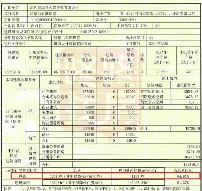 从日前公示的参数来看,绿景白石洲璟庭有住宅、商务公寓、商业等,住宅总共1257户(保障房0户),其中≤90平的户型1193户,占比94.91%。
