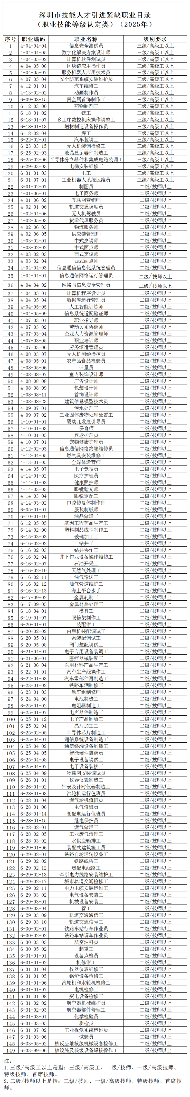 一、根据我市产业发展和社会服务需要,制定《深圳市技能人才引进紧缺职业目录(职业技能等级认定类)(2025年)》,此目录将根据经济社会发展和我市技能人才引进情况动态调整、适时更新。