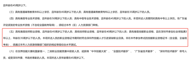 年龄规定:具有高级技师职业资格,且年龄在45周岁以下的人员;具有技师职业资格,且年龄在40周岁以下的人员;具有高级技能职业资格,且在深圳市参加社会保险满3年以上,年龄在35周岁以下的人员。