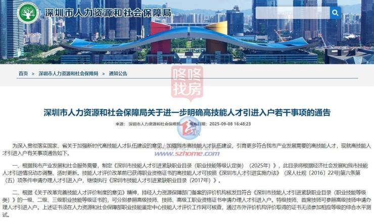 9月8日,深圳人社正式发布《关于进一步明确高技能人才引进入户若干事项的通告》。