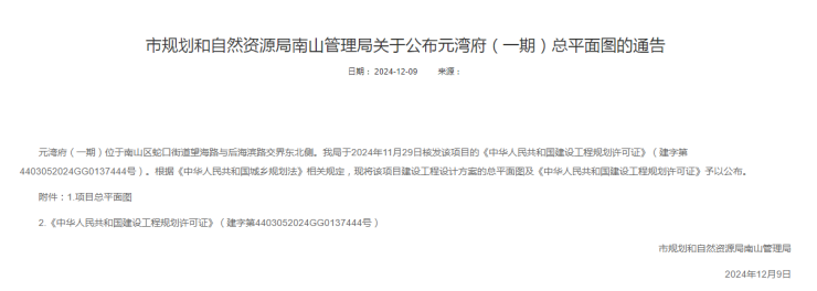 12月9日,深圳市规划和自然资源局南山管理局公布了元湾府(一期)的总平面图,其就是中信深圳湾一期项目,项目推广名定位元湾府!