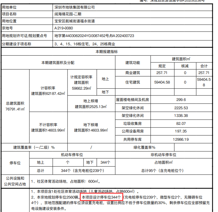深铁阅云境规划总建面约7.7万㎡,计容建面约6.2万㎡,其中,住宅约5.9万㎡,本期规划停⻋位344个。
