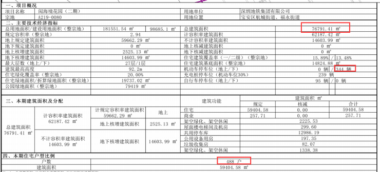 阅海境三期总建面约9.5万㎡,计容建面约7万㎡,其中住宅建面约6.6万㎡,规划总户数534户,本期停车位525个。