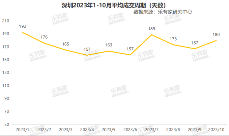 乐有家研究中心数据显示,8月底出政策后,9月市场成交周期明显缩短,客户上车速度加快。成交周期由8月的173天下降到167天。需求集中释放一波后,10月市场再次进入政策观望期,成交周期拉长,上涨至180天,即平均一套房子从挂牌到出售要6个月的时间。