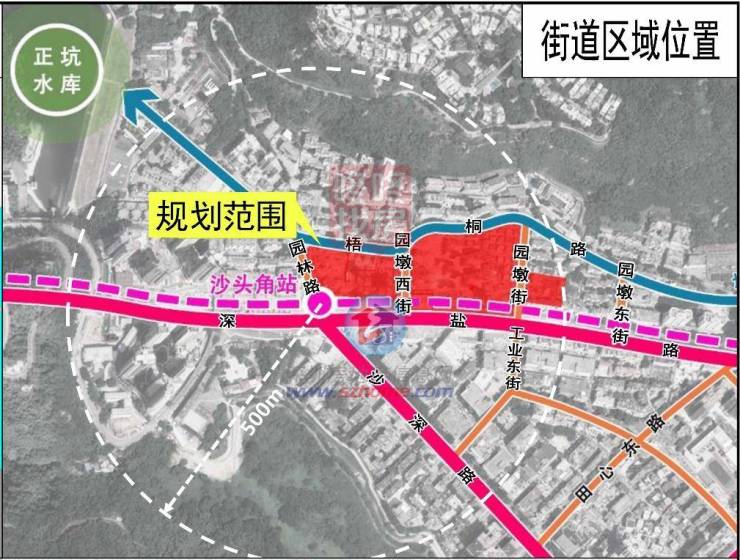 项目位于盐田区沙头角街道沙头角社区,园林路以东、梧桐路以南、圆墩街以西、深盐路以北区域,地处盐田区的西部门户位置,紧邻地铁8号线沙头角站。