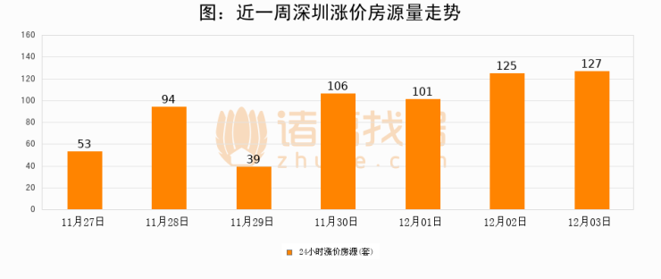 根据诸葛找房数据显示,深圳24小时涨价房源量为127套,较12月02日增加2套,环比上涨1.6%。与此同时,涨价房源占比小幅扩大,业主信心有所提升。