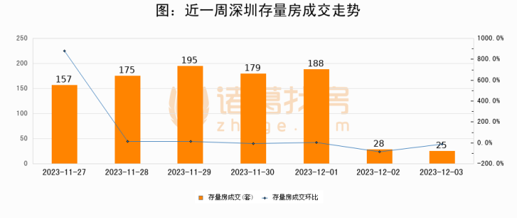从存量房来看,2023年12月03日深圳存量房单日成交25套,比昨日减少3套,环比下降10.7%。从近一周存量房成交来看,深圳存量房日均成交套数为135套,12月03日单日成交25套,低于近一周平均水平81.5%。