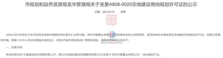 4月19日,深圳市规划和自然资源局龙华管理局变更A808-0025宗地建设用地规划许可证,用地单位由“中建壹品投资发展有限公司,湖北文旅园区建设发展集团有限公司”变更为“深圳华展置业有限公司”。
