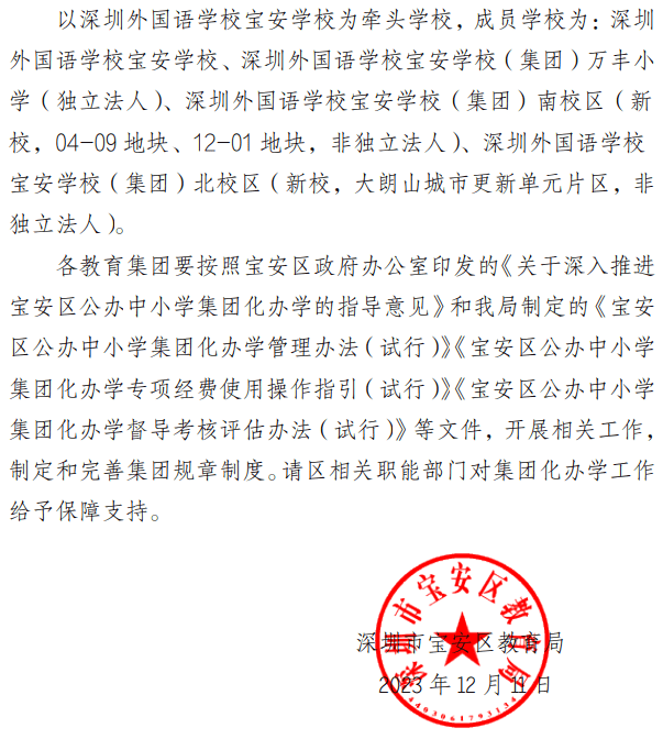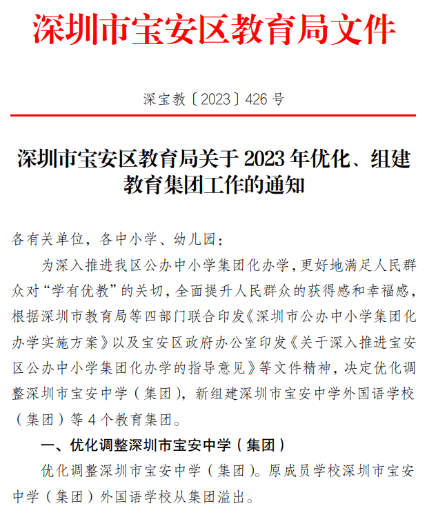 12月11日,宝安区教育局下发文件,优化调整深圳市宝安中学(集团),新组建深圳市宝安中学外国语学校 (集团)等4个教育集团。