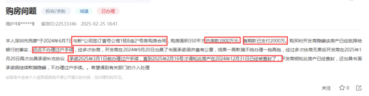 在@深圳领导留言板平台有一则市民留言,称自己花重金买一套无法过户的“糟心房”。