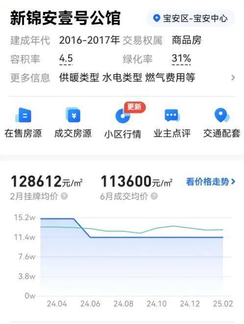 据贝壳找房APP显示,该小区二手房目前挂牌价是12.8万/㎡,去年6月实际成交价已跌至11.36万/㎡。