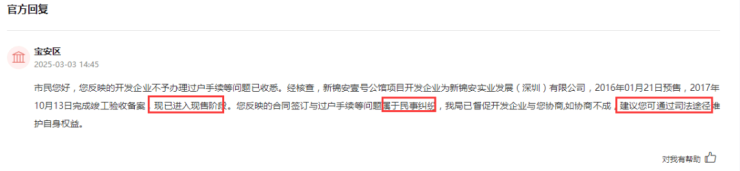 官方称,廖姓买家所面临的问题属于民事纠纷,将督促开发企业与买家协商,并称“如协商不成,建议您可通过司法途径维护自身权益。”