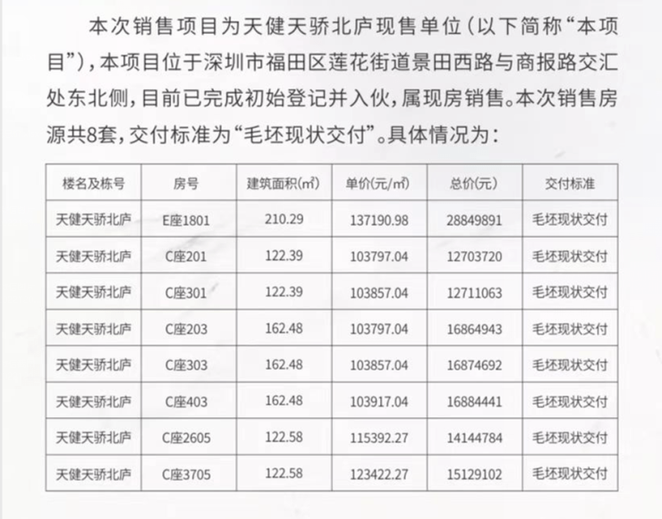 天健天骄北庐此次销售的8套现房,面积段主要为122.39-210.29平方米的产品,单价在10.3万元/平方米-13.7万元/平方米之间,总价在1271万至2885万之间,均为毛坯现状交付。