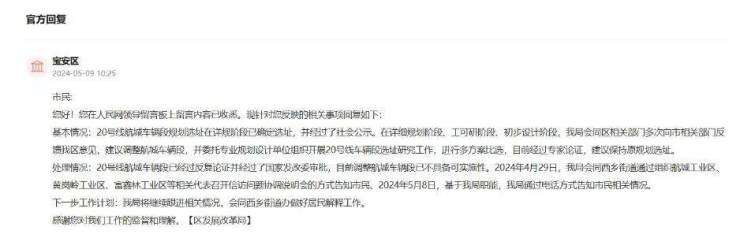 宝安区发展改革局表示,20号线航城车辆段已经过反复论证并经过了国家发改委审批,目前调整航城车辆段已不具备可实施性。下一步,宝安区发展改革局将继续跟进相关情况,会同西乡街道办做好居民解释工作。