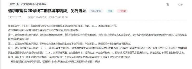 该市民在人民网领导留言板表示,对于深圳市城市轨道交通20号线二期航城车辆段的选址规划,提出了三点质疑——