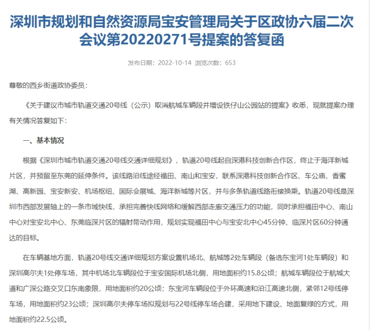综上,该委员建议将城市轨道交通20号线航城车辆段调出深圳国家高新区宝安园区西乡铁仔山片区范围,同时,还建议在广深公路与宝田二路交汇处增设铁仔山公园站。