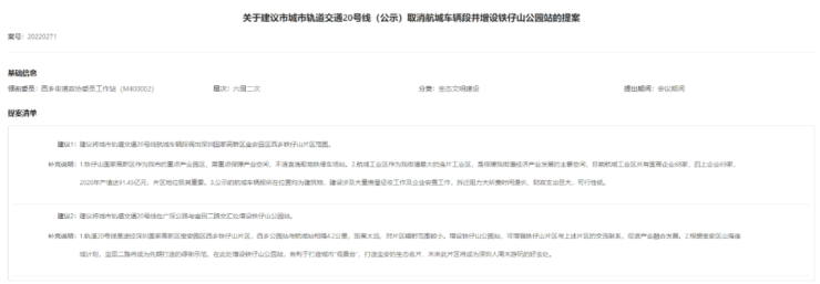 奥一新闻记者检索发现,早在2022年,已有西乡街道政协委员提案,建议市城市轨道交通20号线(公示)取消航城车辆段并增设铁仔山公园站。提案内容提到,航城工业区作为西乡街道最大的连片工业区,是保障西乡街道经济产业发展的主要空间,目前航城工业区共有国高企业68家,四上企业69家,2020年产值达91.45亿元,片区地位极其重要。公示的航城车辆段所在位置均为建筑物,建设涉及大量房屋征收工作及企业安置工作,拆迁阻力大所费时间漫长、财政支出巨大,可行性低。