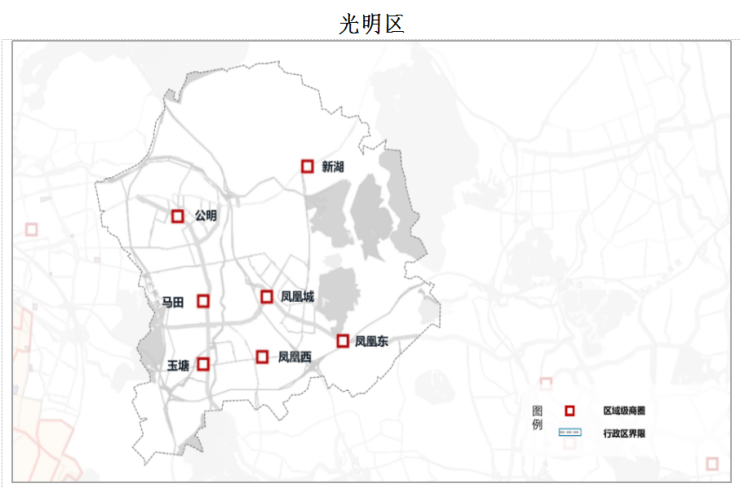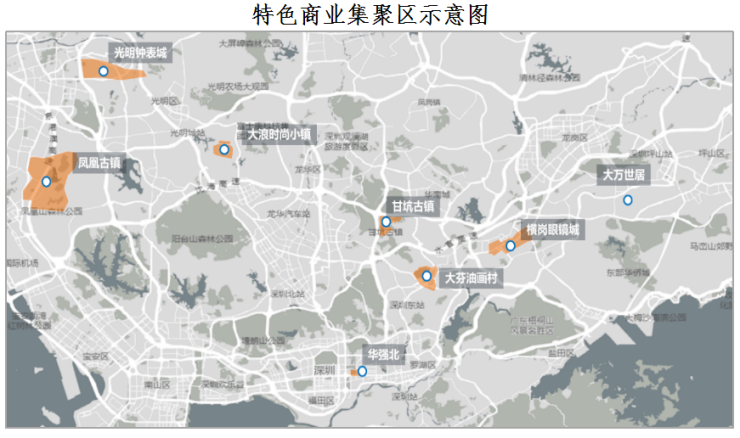 发展策略:围绕轨道6号线打造光明区消费主轴,以凤凰城地铁站及站点周边商业综合体、产业园区等为核心,规划布局凤凰城超级商圈。