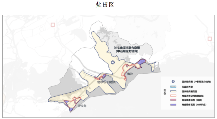 发展目标:落实“宜居宜业宜游的现代化国际化创新型滨海城区”的目标定位,高标准打造沙头角深港融合商圈,依托盐田“山海”“深港”“文旅商”等特色资源,引领全区消费功能的综合性、高能级、高品质发展,打造深港融合免税旅游封面。