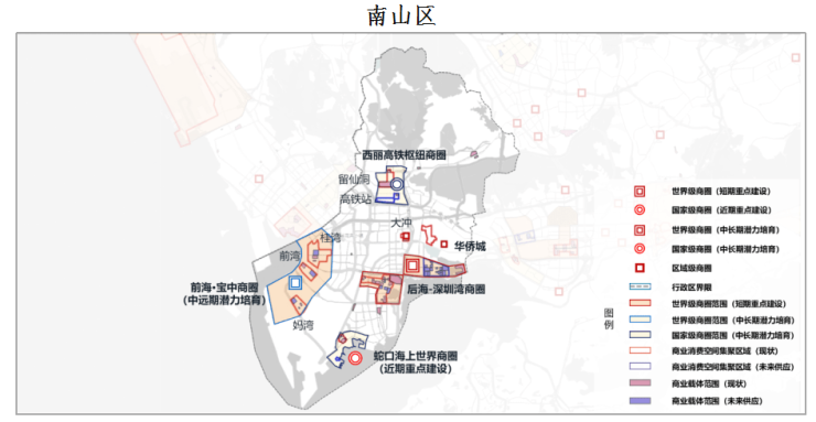 发展目标:聚焦“中央智力区和世界级创新型滨海中心城区”发展定位,充分发挥后海-深圳湾、前海·宝中两大世界级商圈,以及海上世界、西丽高铁枢纽两大全国级商圈的引领作用,辐射带动全区商业整体提质升级,形成消费氛围浓厚、时尚魅力迷人、科创文化赋能、消费场景复合的高品质消费首选地。
