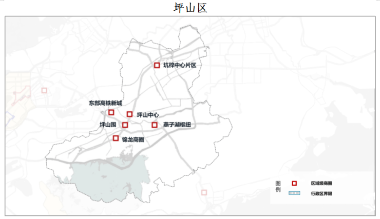 发展策略:加快建设一批成熟商圈,强化坪山中心的商业服务职能和业态升级,着力将燕子湖打造为“山水会客厅、活力新中心”,布局锦龙、坪山围、东部高铁新城、坑梓中心等城市商圈节点,打造特色鲜明、错位发展、类型多样的商圈格局。