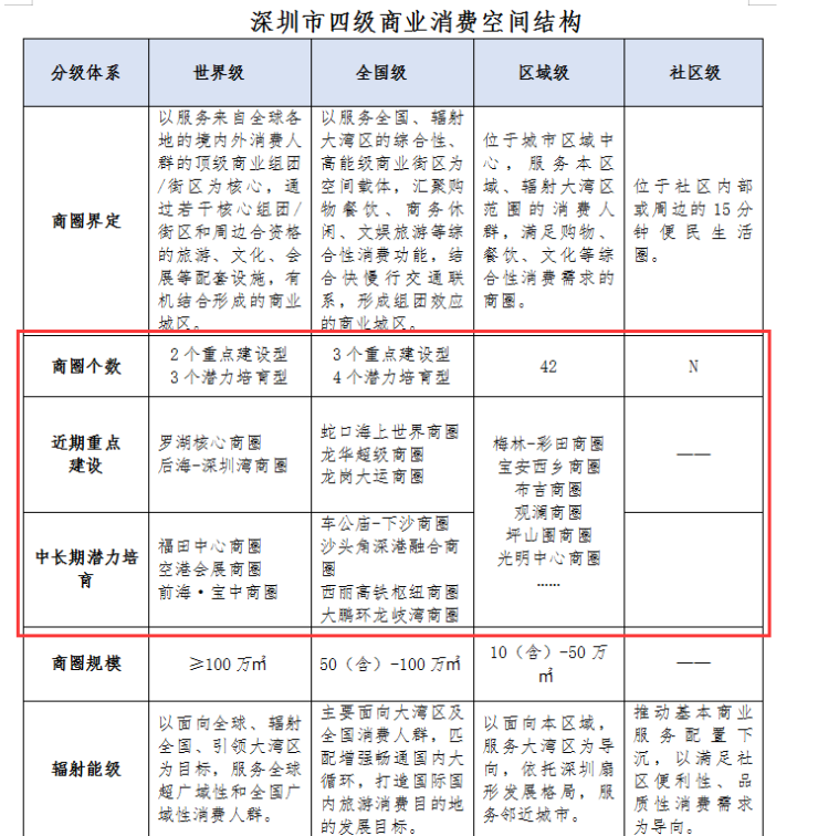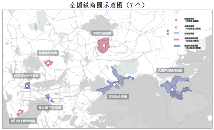 打造7个全国级引领商圈,其中近期重点建设3个(包括蛇口海上世界商圈、龙华超级商圈、龙岗大运商圈3个商圈),中长期潜力培育型全国级商圈4个(包括车公庙-下沙商圈、沙头角深港融合商圈、西丽高铁枢纽商圈、大鹏环龙岐湾4个商圈)。