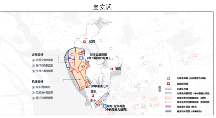 发展目标:聚焦“湾区核心、智创高地、共享家园”发展目标,紧抓前海·宝中、空港会展两大世界级商圈建设机遇,充分发挥深圳宝安国际机场、深圳国际会展中心等重大载体的客流辐射效应,成为世界商务会客、文旅消费目的地。