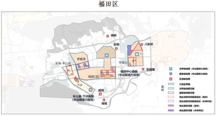 中长期潜力培育型世界级商圈包括福田中心商圈、空港会展商圈、前海·宝中商圈,为占据城市发展战略核心、具备较强商业发展潜力,但需要通过城市更新或新增建设整体提质升级的商圈,预计通过5-10年的发展,商圈依托其内核心商业载体、重大商旅文体设施,辐射带动周边片区,整体形成具有全球影响力的商业格局。