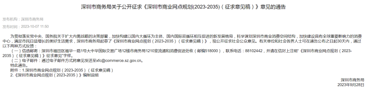 10月7日,深圳市商务局发布公开征求《深圳市商业网点规划(2023-2035)(征求意见稿)》意见的通告。