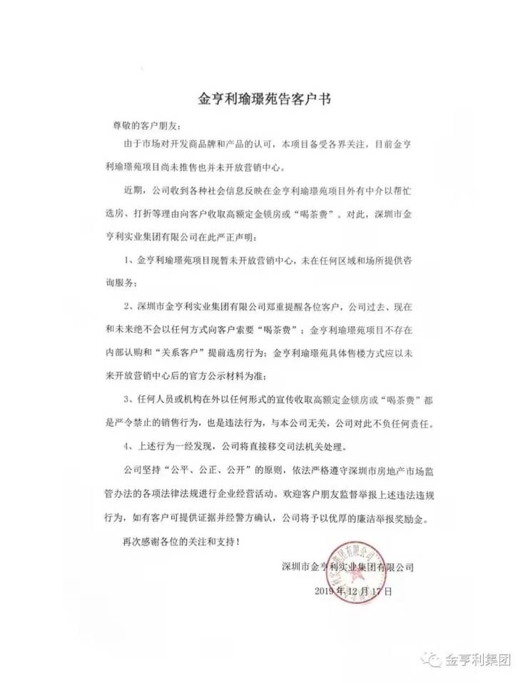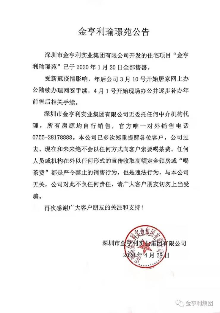 2020年4月,金亨利发布公告,项目开发的金亨利瑜璟苑已于1月20日全部售罄,同时声明,公司从未索取过任何“喝茶费”等违规行为。