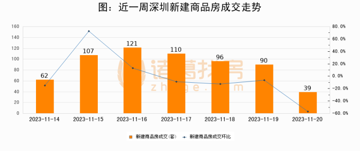根据深圳市住房和城乡建设局数据显示,2023年11月20日深圳新建商品房成交39套,较昨日减少51套,环比下降56.7%