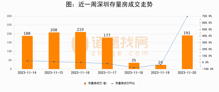从存量房来看,2023年11月20日深圳存量房单日成交191套,比昨日增加167套,环比上涨695.8%。从近一周存量房成交来看,深圳存量房日均成交套数为147套,11月20日单日成交191套,高于近一周平均水平29.9%。