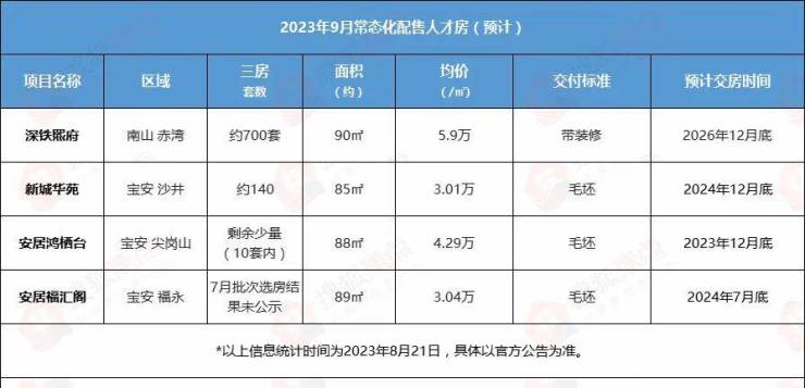 除了龙华星河开市客已经发布配售公告外,9月还将有南山、宝安等区域的人才房将进行常态化配售,房源主要以三房为主,选择较多的依次有南山深铁熙府,宝安的新城华苑、安居福汇阁等项目。